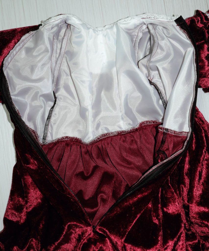 ビーチェちゃんのドレスでは、布地は10年間残っていたストレッチのベルベットを使っていて、それを使い切るつもりで多めに使っています。そのため、スカートの長さは2mぐらいになっていたので完全な全円スカートになっていましたが、今回はニットクラッシュベロアを使って1.6mぐらいに短くしてますので、ビーチェちゃん版まではありませんが十分なボリュームがあります。また、スカート終端はビーチェちゃんの服ではレースになっていましたが、今回は白の生地をたっぷり5m近く使ってフリルを付けました。元の3倍近い長さの生地でフリルを作っているので、フリルもマシマシです。