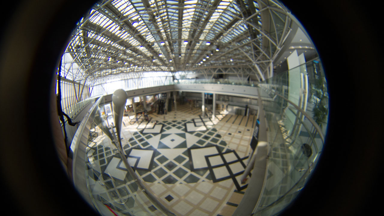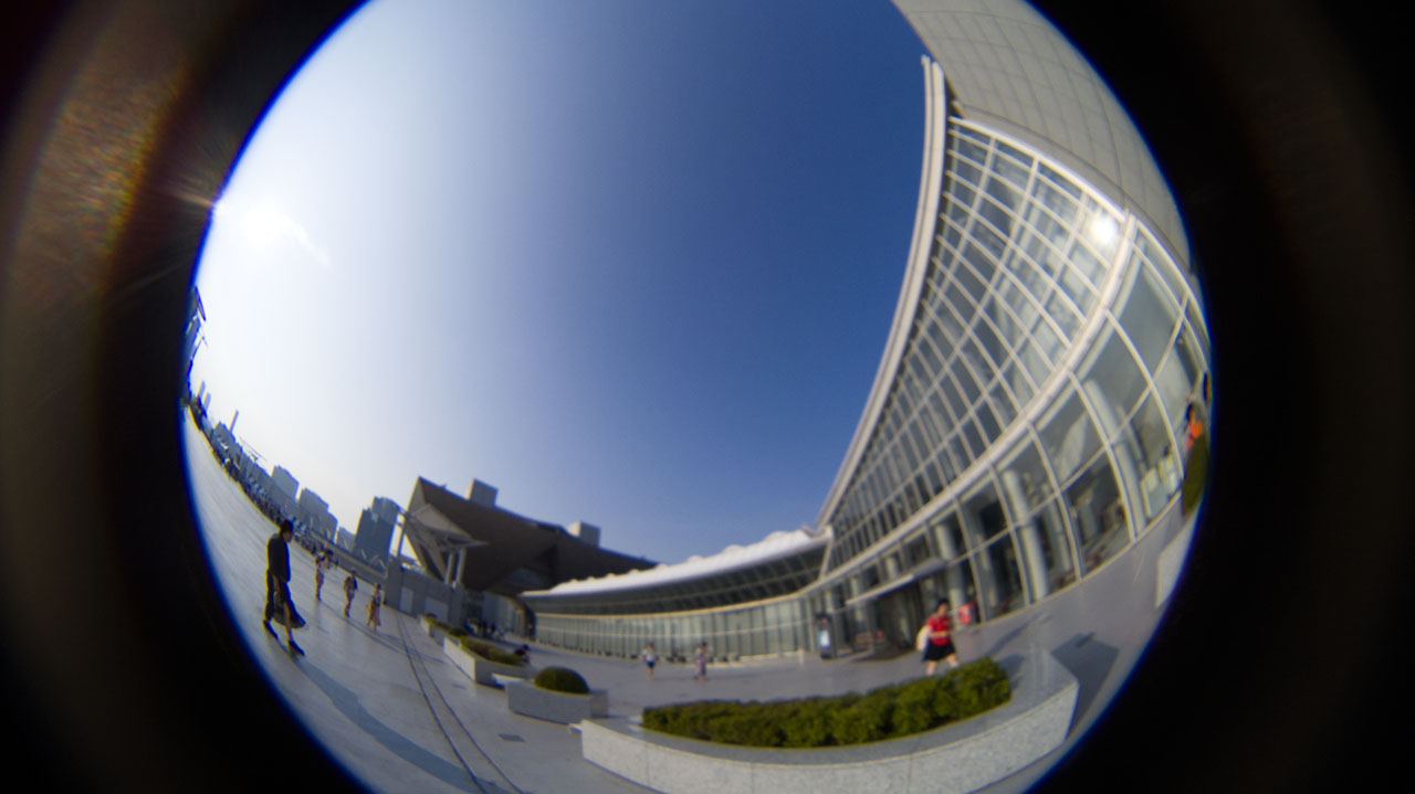 筐体は3Dプリンタで作ってあるんで、積層のあとがあったり結構精度としては?ですが、トイレンズとしてはいいんじゃないでしょうか。ということで、その場で装着してビッグサイトでちょっといくつかとってみたんで作例。実際にはトリミングして使う感じでしょうけど、全天球って感じで映るのが面白いです。ピント合わせが難しいので、眠い画質ですが仕方ないですね。