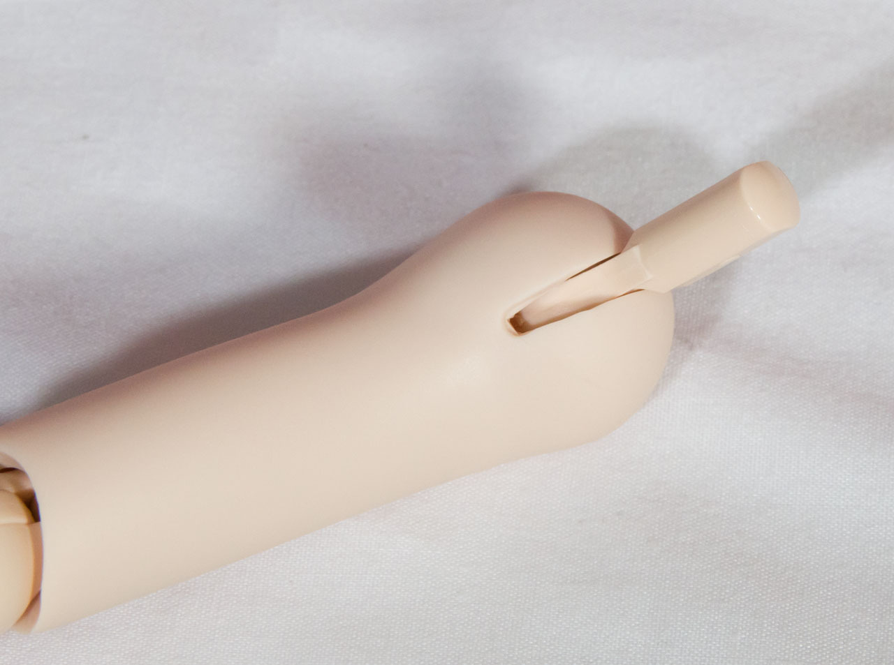 あと目立つのは腕と手首の間など各軸との接合部です。ここにロック構造があって抜けにくくなっています。いろいろポーズを変えて撮影していると、不意にここがすっぽぬけて、再度はめ込むのに苦労することがありますが、これを起きにくくする工夫が入っています。