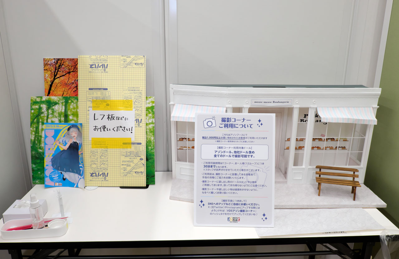 1つは、自分は知らなかったので用意していなかったのですが、1000円以上買ったら撮影ブースで自分のドール(他社ドール可)を30分間撮影可能というものです。仮設ブースですから、ボークスの店舗にあるような本格的というものでもないですが、背景ボードや小物を色々その場で貸し出ししてくれるので、そこそこの撮影ができます。たまたま、ドール用の布の端切れをいくらか買ったので、ドールは持ってきていなかったのですが、テスト撮影みたいな感じでちょっと使ってみましたので、次回にまたこれがあるかはわかりませんが、参考程度に。