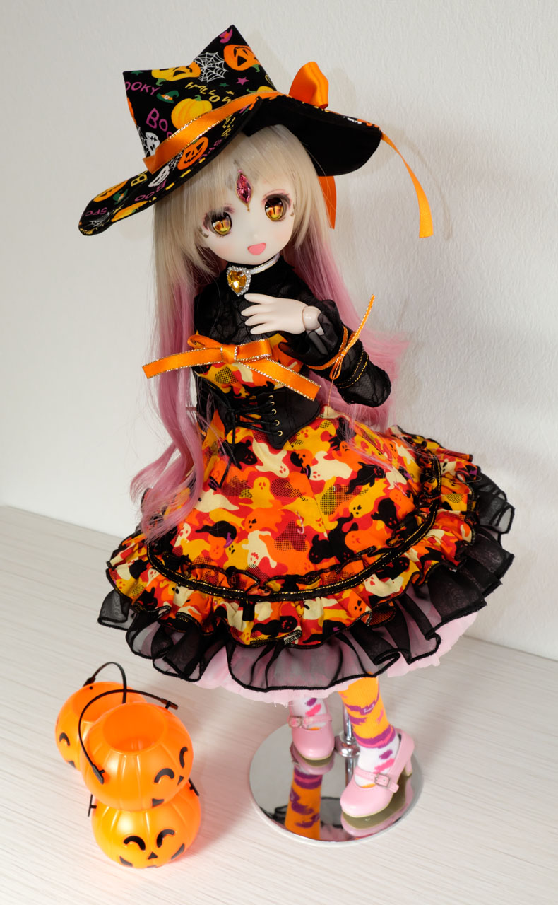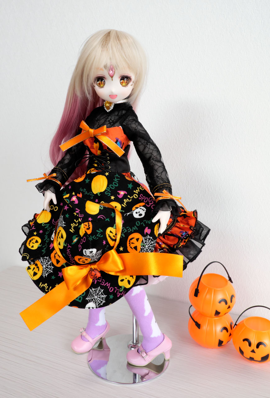 また、この服はパニエにボークスのMDD用のぽんぽんパニエ・ミニを履かせることを前提に型紙が設計されています。パニエなしでもそれなりには見えますが、カラーのパニエを入れることで、外側の黒のフリルとのコントラストが出て、より見栄え良くすることができます。