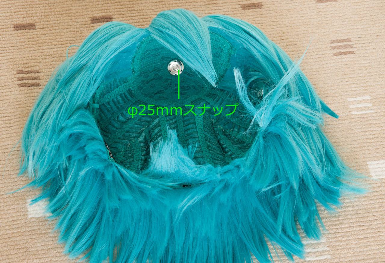 そのため、直接ヘッドに穴をあけて、ウィッグ取り付け用のスナップボタンをつけるようにしています。この相対配置を共通化することで、違う形状の着ぐるみヘッドでも問題なく簡易に脱着、かつ強力に固定できるようになりました。ここに掲載した動画のように首をぶんぶん降ってもツインテの重量に負けてウィッグが抜けることはありません。そんなわけで、前に作ったヘッドでも今回のタイプに合わせて取り付け方法を修正しましたので、今回作ったウィッグを装着できますし、逆も可能です。