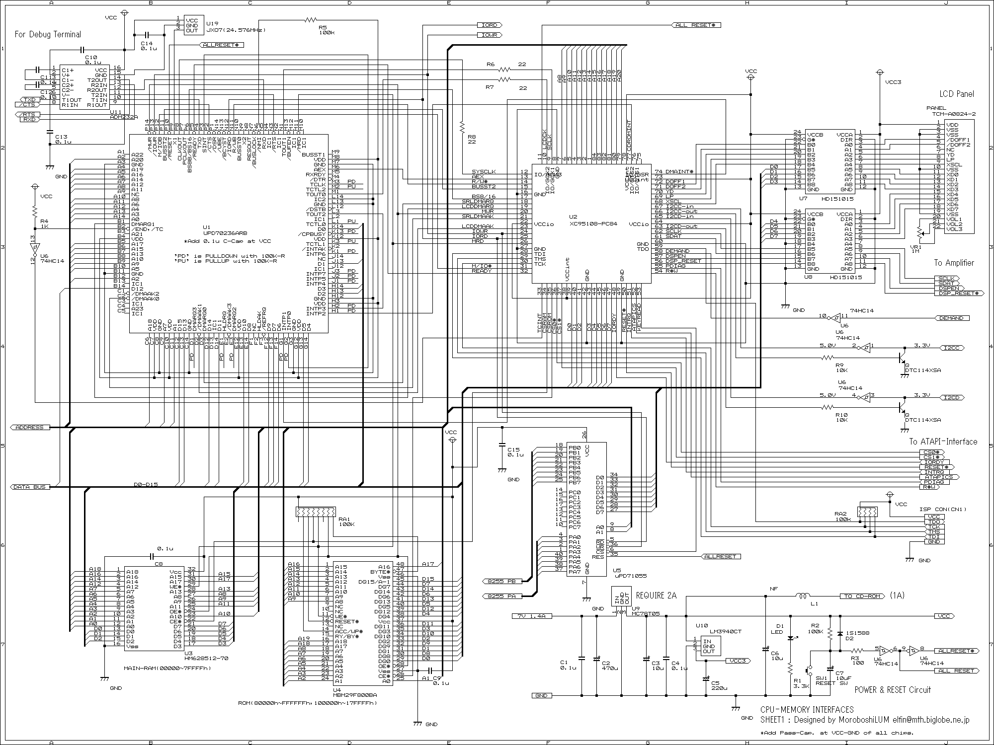 なお、フラッシュROMにはボトムブートタイプを使っていますが、マッピング上はトップブート(MBM29F800TA-12)を使った方が無駄がないです。今回ボトムブートなのは、手持ちがボトムブートのフラッシュしかなかったからです(^^;;;; (ボトムブートですと、データ保存エリアに端数セクタが入ってきますので使い勝手が悪いので)。